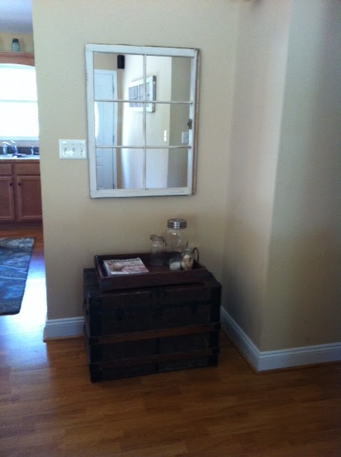 I removed Foster's crate and put it in the office and moved an antique trunk, that was positioned near the door, to create a cute little nook, this is probably my favorite part of the living room and I found a gallon sized mason jar at Target to add to my collection, as if I don't have enough, look above my cabinets in the kitchen